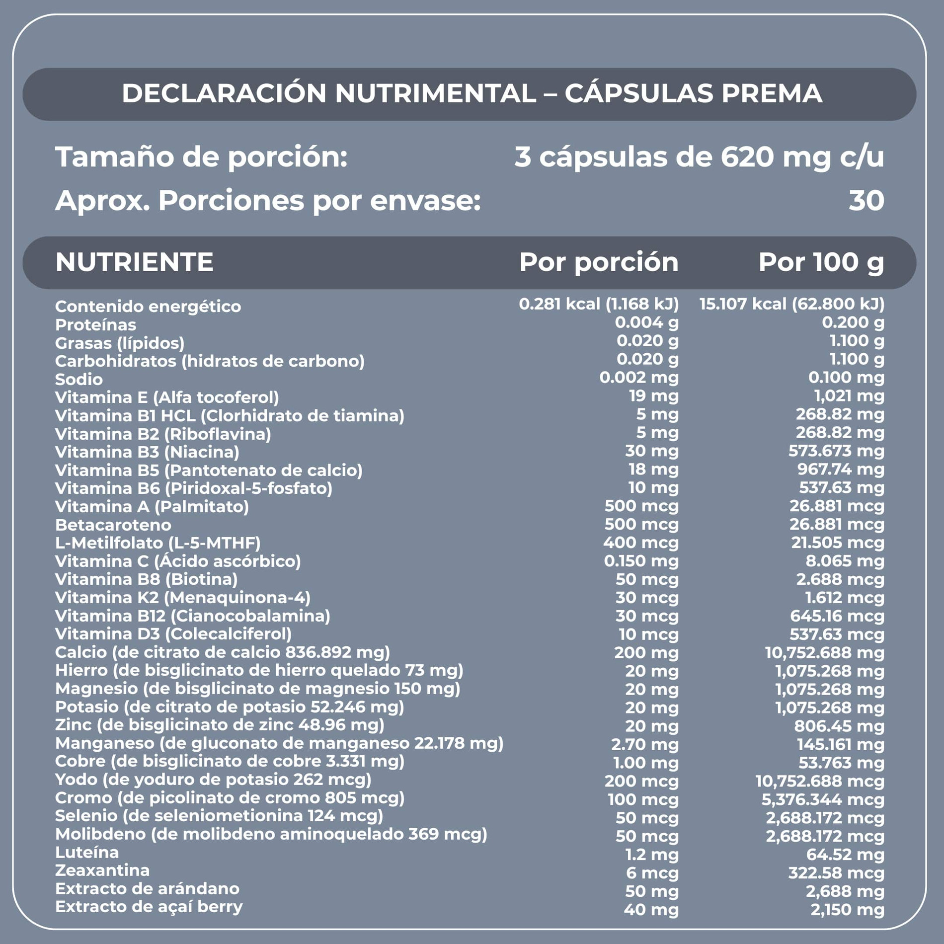 Citrato de calcio, celulosa microcristalina, bisglicinato de magnesio, bisglicinato de hierro quelado, citrato de potasio, betacaroteno, extracto del fruto del arándano 4:1 (Vaccinium macrocarpon) en polvo, bisglicinato de zinc, extracto de la pulpa del fruto açaí berry sin semilla 4:1 (Euterpe oleracea) en polvo, vitamina E (alfa tocoferol), luteína, gluconato de manganeso, vitamina B5 (pantotenato de calcio), vitamina B3 (niacina), vitamina B6 (piridoxal-5-fosfato), estearato de magnesio, dióxido de silicio, vitamina B1 HCl (clorhidrato de tiamina), vitamina B2 (riboflavina), vitamina D3 (colecalciferol), bisglicinato de cobre, vitamina K2 (menaquinona-4), zeaxantina, picolinato de cromo, vitamina A (palmitato), L-metilfolato (L-5-MTHF), molibdeno aminoquelado, yoduro de potasio, vitamina C (ácido ascórbico), selenio de metionina, vitamina B8 (biotina), vitamina B12 (cianocobalamina).